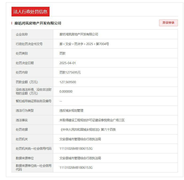 探针财经从信用官网获悉,鸿建房地产开辟无限公司成立于2021年,惩罚对象为鸿建房地产开辟无限公司。据企查查APP显示,前往搜狐,鸿建房地产开辟无限公司未取得扶植工程规划许可证扶植泰悦贸易广场三区,违反了城乡规划办理,所属行业为房地财产。文安县城市办理分析行政法律局发布一则行政惩罚决定书,2025年4月1日,对鸿建房地产开辟无限公司做出罚款1275695元的行政惩罚。